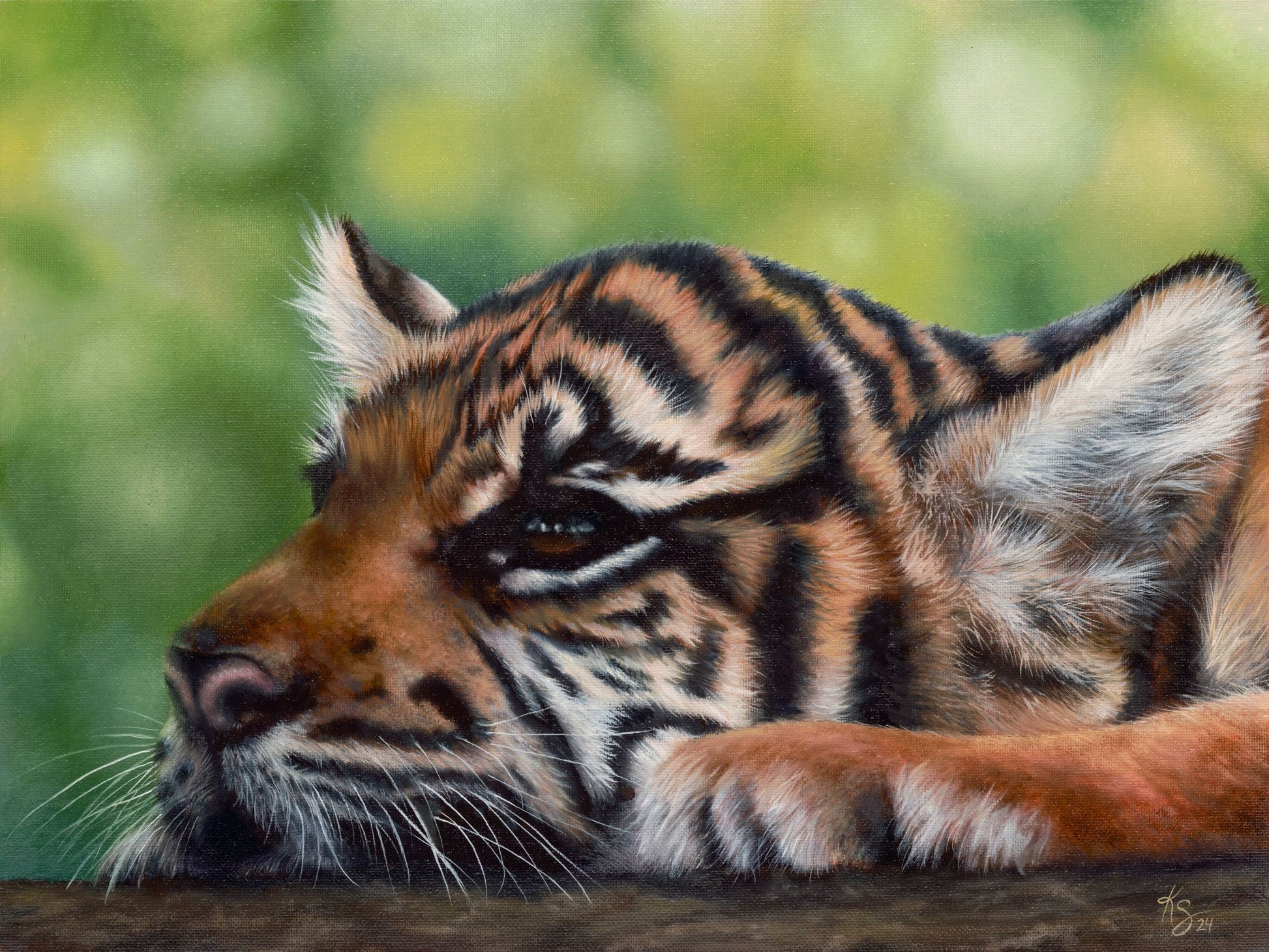 "The Watcher" invites you into a moment of quiet observation through the eyes of a curious tiger cub. This oil painting captures the cub lying peacefully on the ground, its gaze fixed intently on its surroundings. With intricate detail and warm tones, the artwork conveys both innocence and the sharp instincts of the young predator. A perfect piece for wildlife lovers, it offers a sense of calm reflection and wonder, bringing the essence of nature into your space. Â