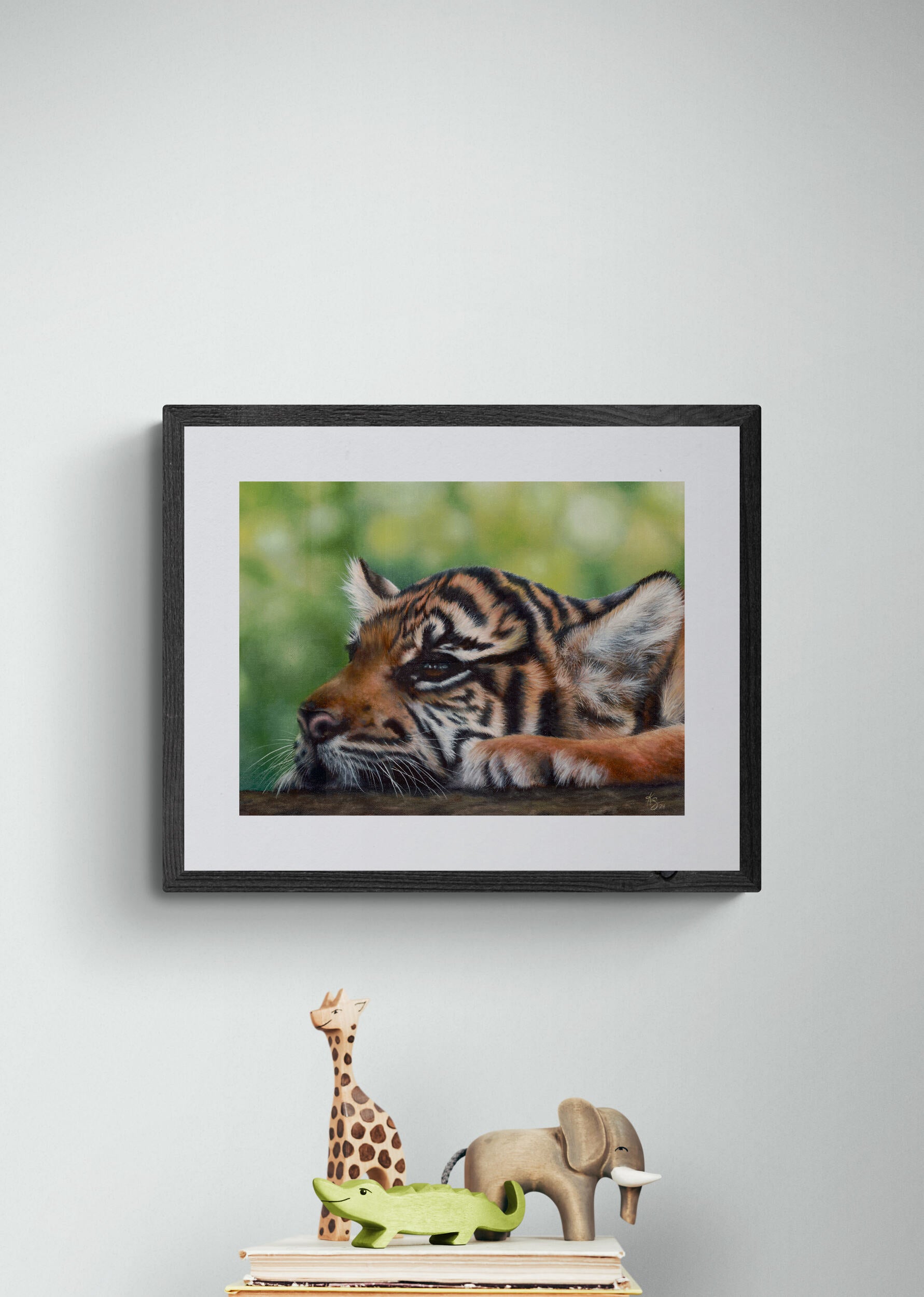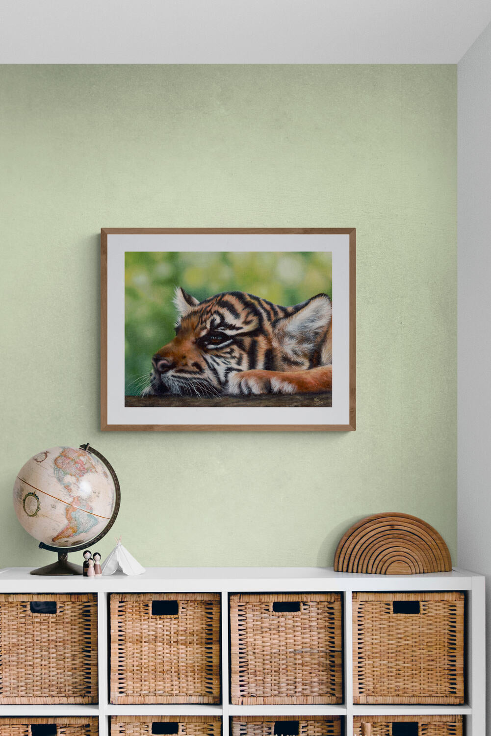 Printed on premium fine art paper with a smooth matte finish and ready for framing, this artwork allows the tiger cub's irresistible charm to shine.